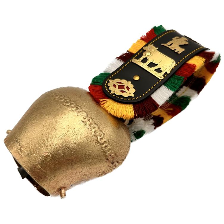 The cowbell is made of sheet steel and is finished in a brass bath.