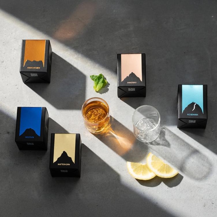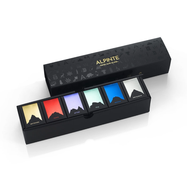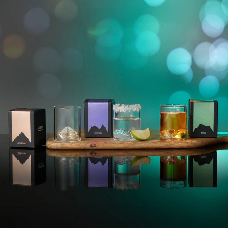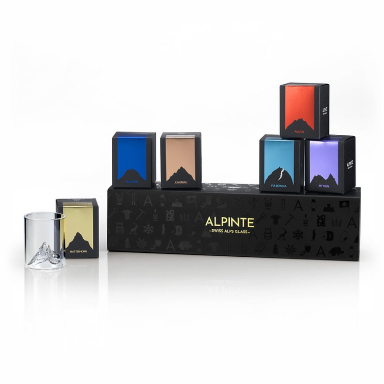 Ensemble de 6 verres à liqueur ou digestif faits main, chacun représentant les sommets du Cervin, de la Dent Blanche, de la Jungfrau, des Dents du Midi, du Titlis et de l`Eiger. Livré dans un magnifique coffret coloré de 6 unités, c`est un véritable régal pour les yeux... et pour les papilles qui ne laissera personne indifférent.