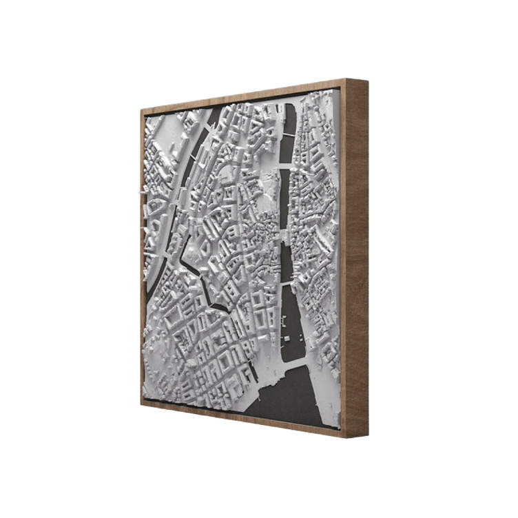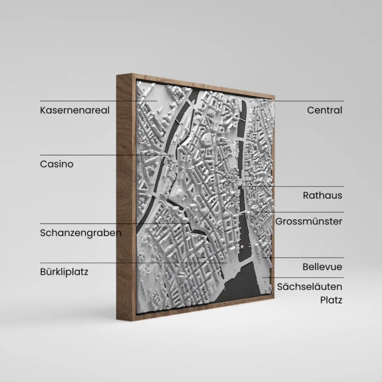 Maquette de ville très détaillée, fabriquée à partir de filaments d`amidon de maïs durable, montée sur un panneau MDF noir dans un cadre en hêtre – imprimée en 3D dans notre usine de Zurich.