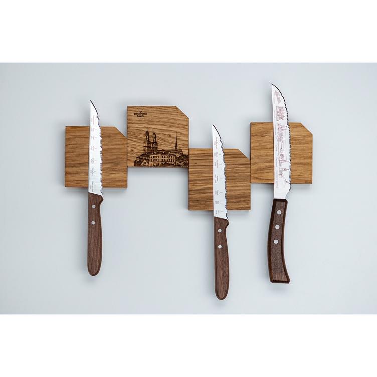 Cubi portacoltelli magnetici realizzati a mano in rovere. Autoadesivi e facilmente rimovibili. I cubi possono essere disposti e personalizzati individualmente. Disponibili con o senza panorama e combinabili.