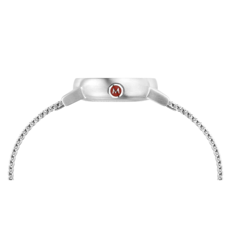 Mit ihrem harmonisch geformten, brossierten Edelstahl-Gehäuse und einem Durchmesser von 26mm schmückt die evo2 jedes noch so zierliche Handgelenk. Das kratzfeste Saphirglas sorgt trotz ihrer feinen Grösse dafür, dass sich die Zeit dieser minimalistischen Uhr dank dem legendären Design jederzeit gut ablesen lässt. Die ergonomische, rote Krone und das Milanaise-Mesh-Band unterstreichen das Know-how von Mondaine.