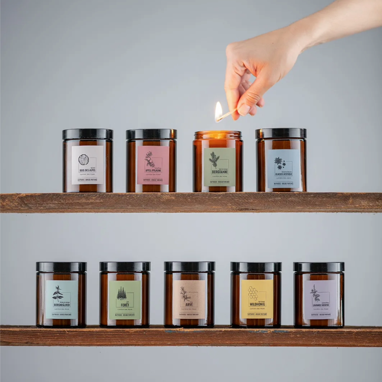 Über Jahre hinweg hat Lumière des Alpes verschiedene Aromen, Wachsmischungen und Gefässe miteinander kombiniert und ausprobiert. Das Resultat ist diese Duftkerzen-Kollektion mit heimischen Aromen in höchster Qualität. Jede Duftmischung wird sorgfältig von Hand angerührt und mit dem Wachs in die Gläser abgefüllt. Bis hin zur händischen Beschriftung der Gläser finden alle Arbeitsschritte in der Schweiz statt. Dezente, erdige Pastelltöne mit den zum Duft passenden Zeichnungen schmücken neu unsere Apotheker-Gläser. Die Etiketten, einzeln von Hand angebracht, fühlen sich durch den speziellen Softtouch-Lack angenehm in der Haptik an.